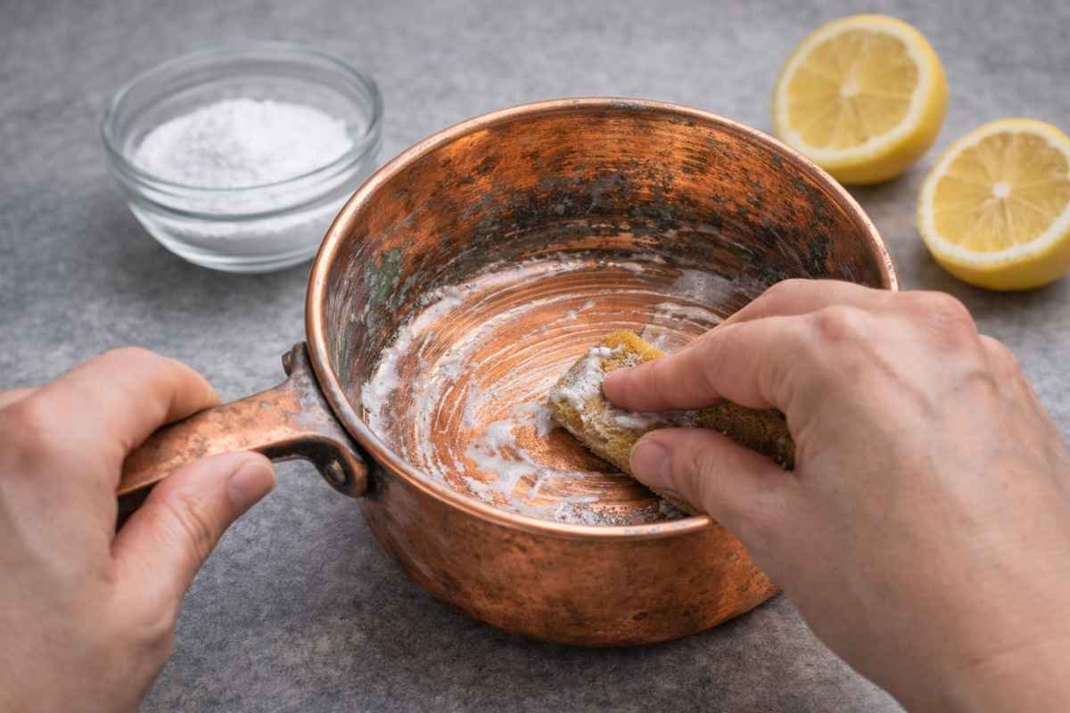 Usa solo metodi naturali come limone o aceto. Evita prodotti chimici industriali su come pulire il rame delle pentole per scongiurare contaminazioni chimiche nelle tue pietanze.